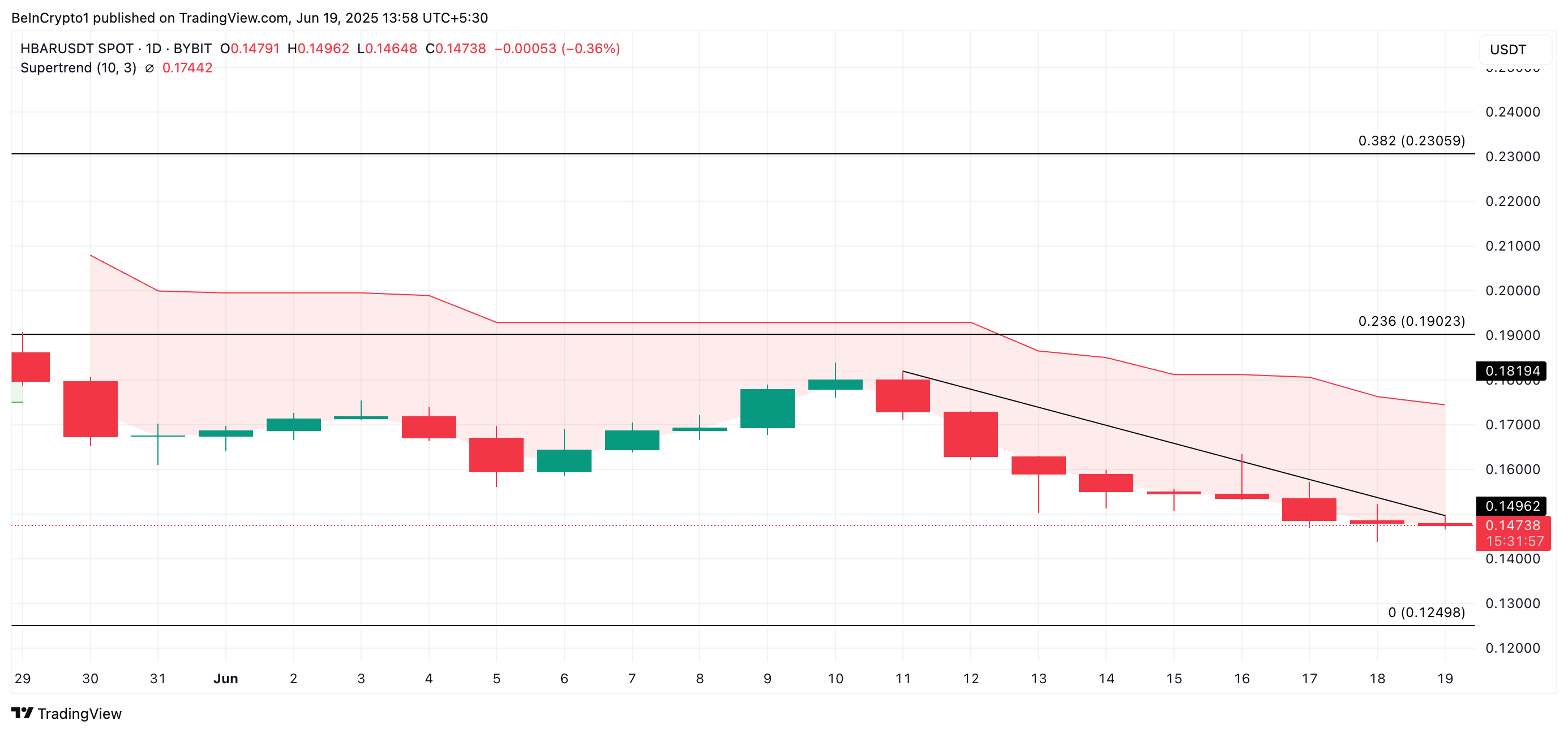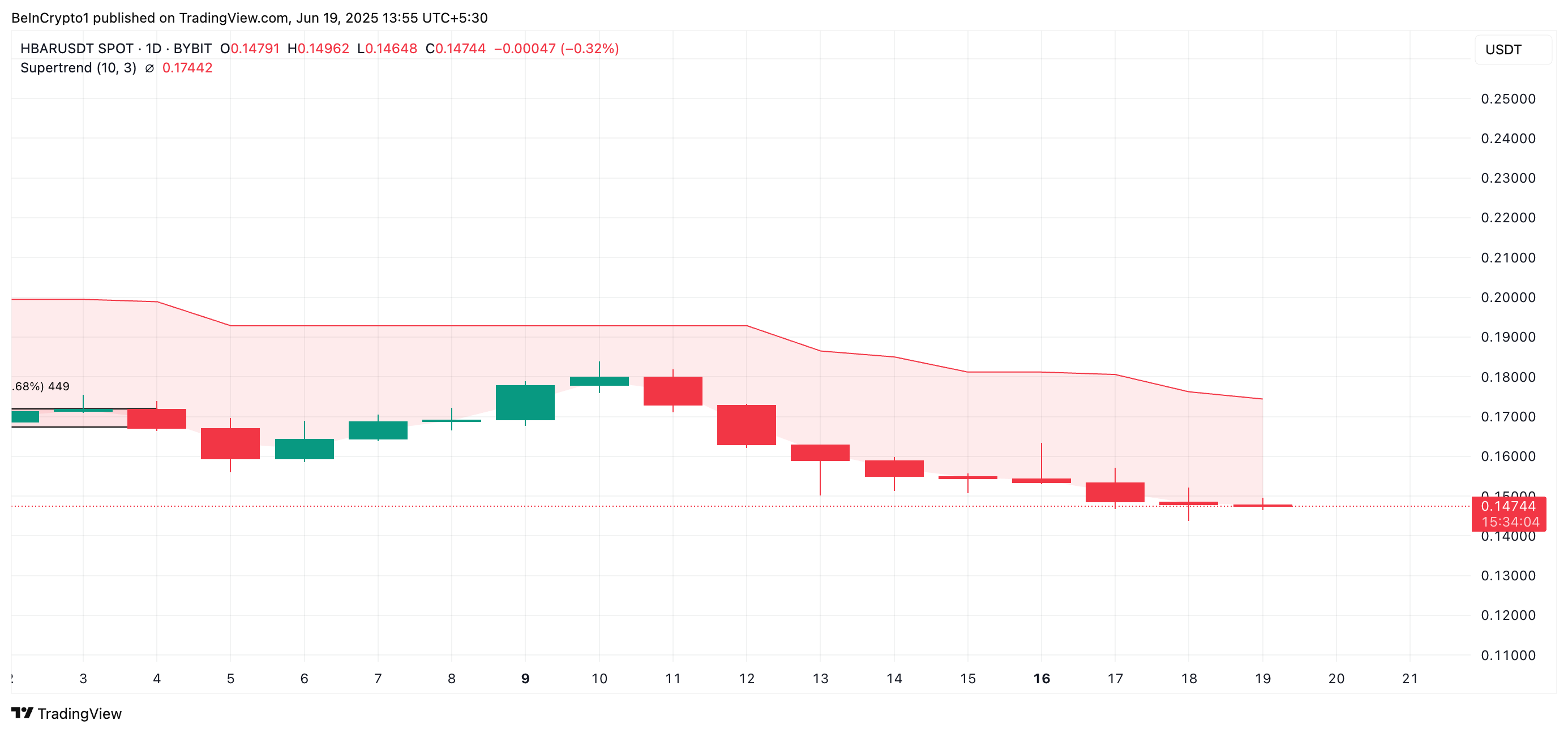 Сонымен қатар, HBAR-дың күнделікті графиктегі Супертренд сызығының орнатылуы осы аюлық көзқарасты растайды. Баспасөз уақытында бұл индикатор токеннің бағасынан жоғары 0,14 долларда динамикалық қарсылық қалыптастырады.
