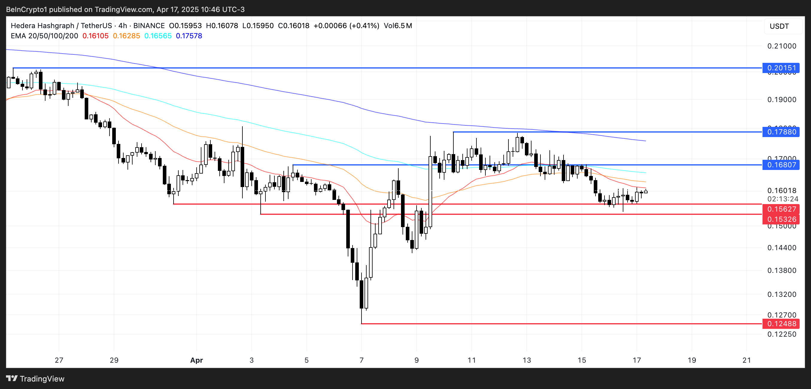 Соған қарамастан, HBAR бағасы жақында 0,156 доллар және 0,153 доллар деңгейлерінде қолдауды сынап, ұстап тұрды, бұл сатып алушылардың негізгі деңгейлерді әлі де қорғап жатқанын білдіреді. Егер тренд осы жерден кері бұрылса, HBAR қалпына келтіру қозғалысын бастап, алдымен 0,168 доллар кедергісін нысанаға алуы мүмкін.