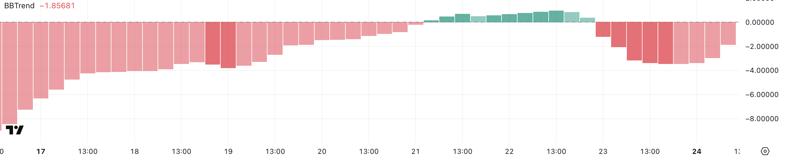 Әдетте, 0-ден жоғары мәндер бұқа жағдайларын, ал 0-ден төмен мәндер аюлы импульсті көрсетеді. Hedera-ның BBTrend көрсеткіші қазір -1,85 деңгейінде болғандықтан, соңғы серпіліске қарамастан, аюлы қысым әлі де бар екенін көрсетеді.