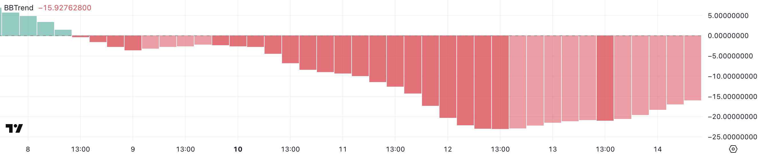BBTrend мәні терең теріс болғанда, бұл күшті аюлы қысымды білдіреді, ал BBTrend-тің көтерілуі – әсіресе экстремалды төмен деңгейлерден – көбінесе сату импульсінің әлсіреуін көрсетеді.