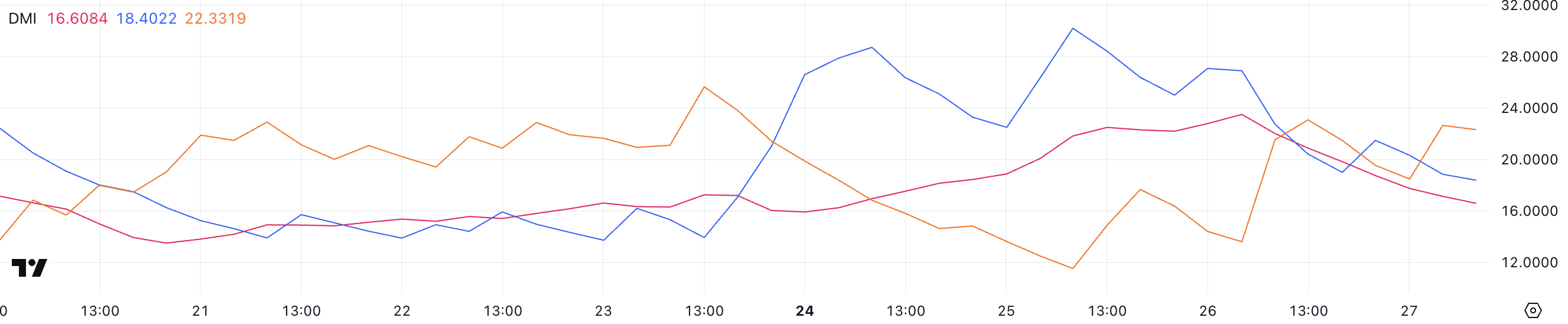 ADX-пен қатар, DMI-дің +DI (Оң бағыттық индикатор) және -DI (Теріс бағыттық индикатор) бағыт туралы түсінік береді. Қазіргі уақытта +DI 18,4-те, кешегі 26,9-дан төмендеді, ал -DI 13,61-ден 22,33-ке көтерілді.