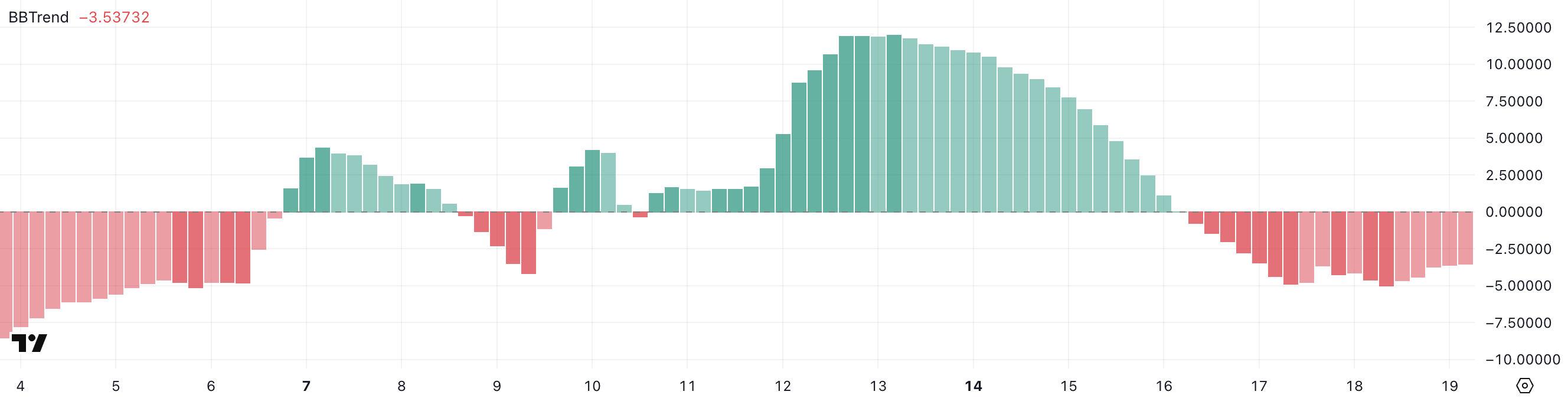 BBTrend немесе Bollinger Band Trend Bollinger жолақтарының кеңеюі немесе қысқаруын талдау арқылы баға трендінің күшін және құбылмалылығын өлшейді.