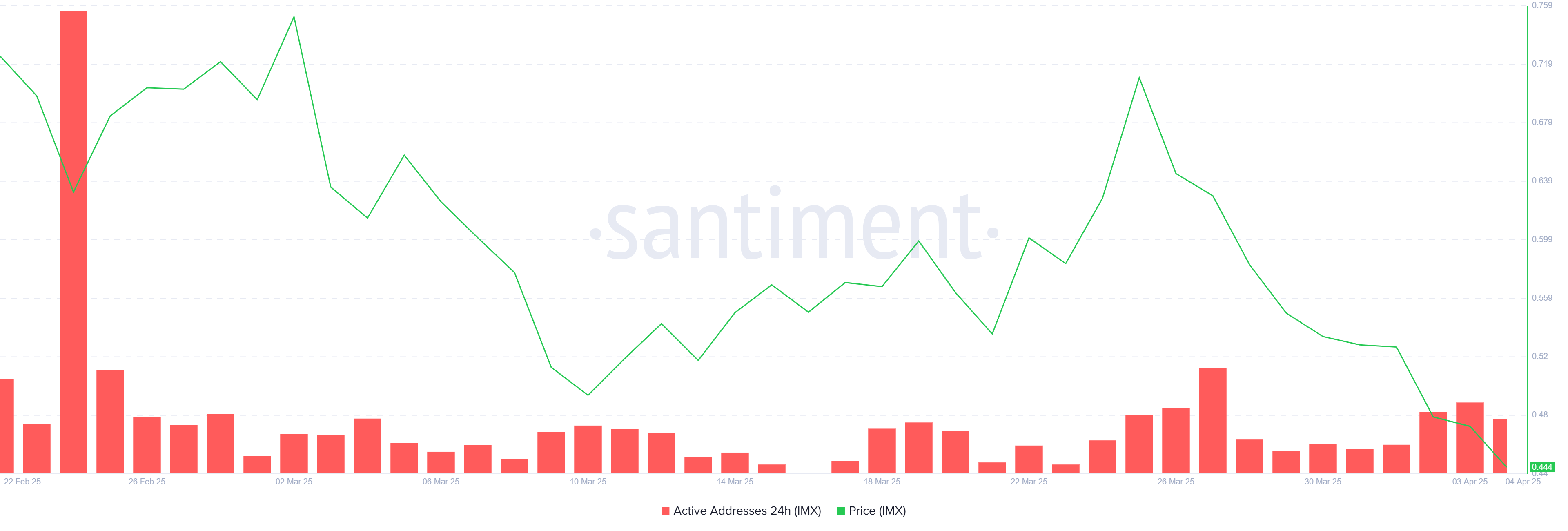 IMX бағасы соңғы екі аптада шамамен 40%-ға төмендеді, 30 млн токеннің сатылуы төмендеуде маңызды рөл атқарды. Жазу кезінде баға 0,433 доллар деңгейінде, 0,400 доллар дағдарыстық қолдау деңгейінен сәл жоғары тұр. Егер бұл қолдау бұзылса, баға одан әрі төмендеп, 0,375 доллар немесе одан төмен деңгейге жетіп, жаңа тарихи минимумға әкелуі мүмкін.
