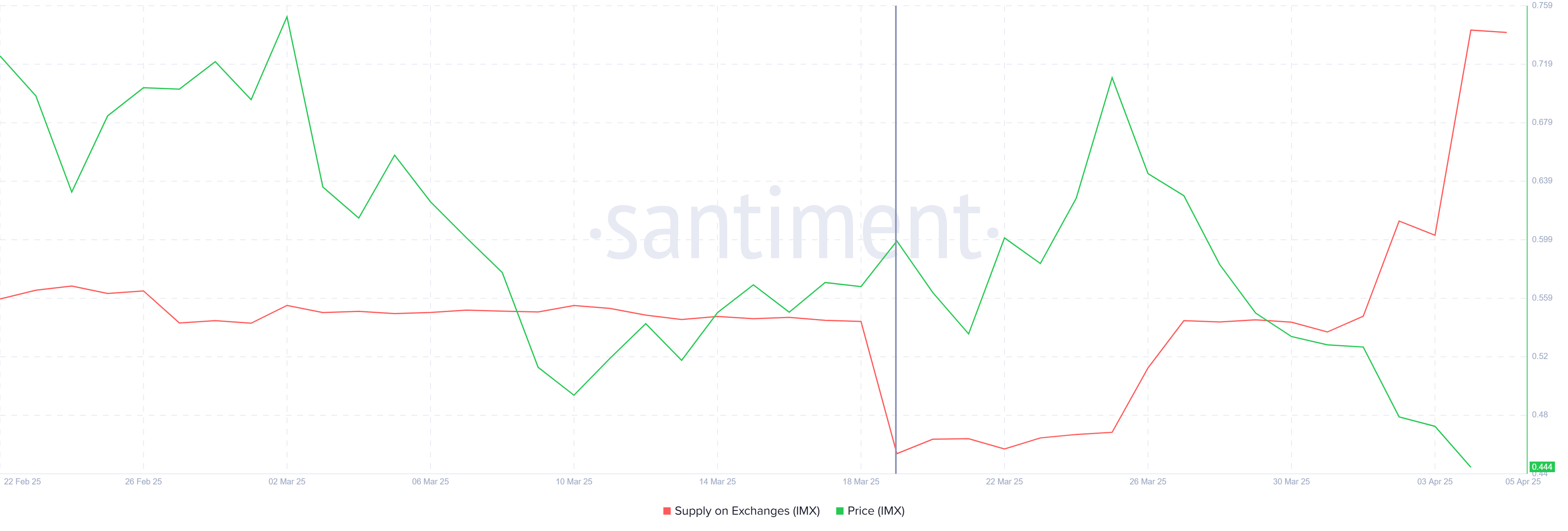 Immutable-дің биржалардағы ұсынысы соңғы екі аптада күрт өсті. Жалпы 30 млн IMX токендері қосылып, жалпы ұсыныс 165 млн IMX-ке жетті. Бұл ұсыныстың өсуі шамамен 13 млн долларды құрайды және инвесторлардың көңіл-күйінің өзгергенін көрсетеді.