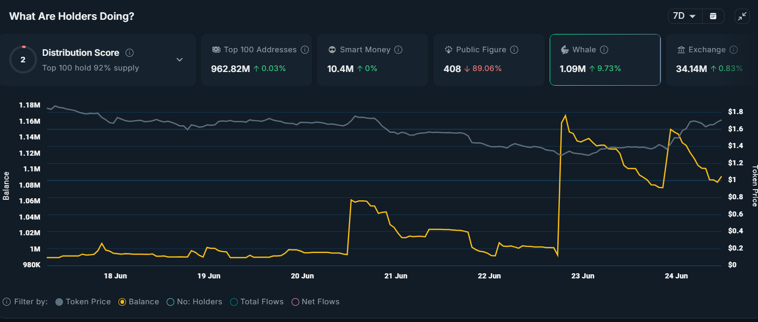 Virtuals Protocol киттердің қызығушылығын тудырды, дегенмен минималды деңгейде, соңғы 24 сағат ішінде небәрі 25 000 доллар көлемінде VIRTUAL сатып алынды. Осыған қарамастан, альткоин айтарлықтай сату қысымына тап болды, бұл жинақтау мен тарату арасындағы тепе-теңдікті көрсетеді. Бұл активтің жақын арадағы баға қозғалысына қатысты нарықтағы аралас көңіл-күйді тудырды.