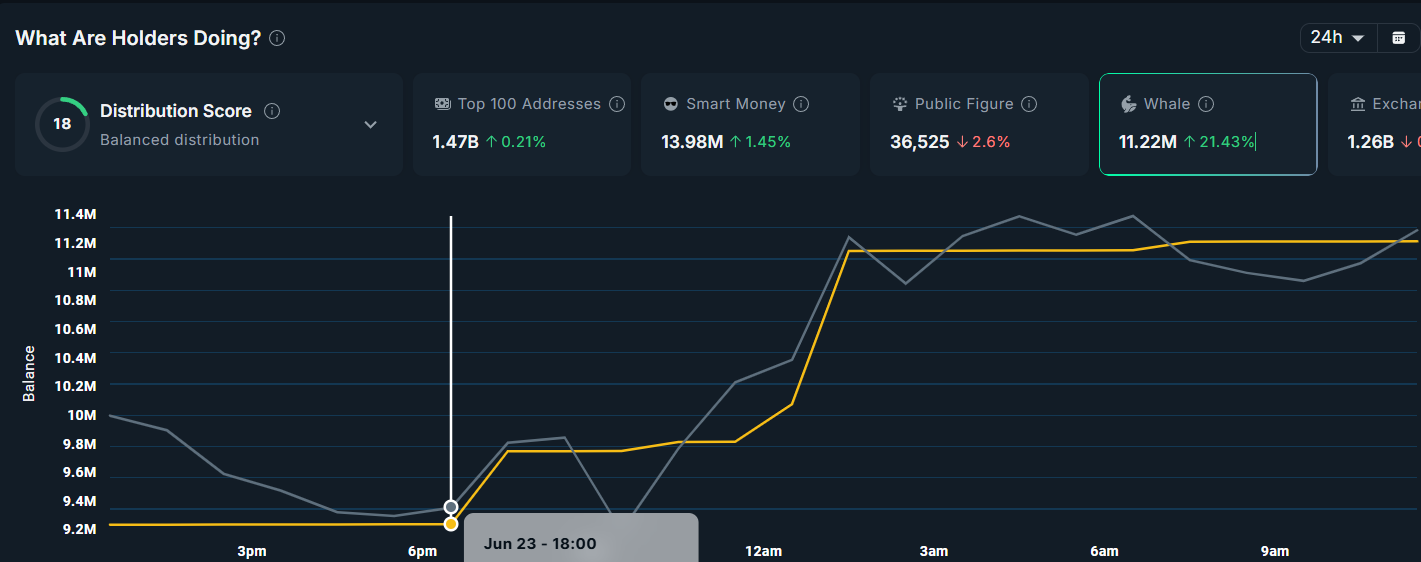 AERO UNI-ге ұқсас киттердің белсенділігін бастан кешірді, киттер активті біртіндеп жинақтауда. 24 сағаттан аз уақыт ішінде 1,6 млн доллардан астам құны бар 2 млн-нан астам AERO сатып алынды. Бұл жинақтау ірі инвесторлардың қызығушылығының артып келе жатқанын көрсетіп, AERO бағасының қозғалысына оң әсер етуде.