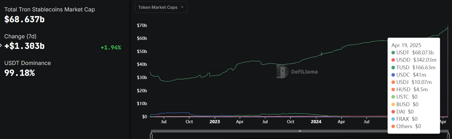 Сонымен қатар, Tron блокчейні стейблкоин есеп айырысуларында күшті серпінге ие болып, Ethereum-нан кейін екінші орынға шықты. Жылдам және төмен құнды транзакцияларды өңдеудегі тиімділігі оны Tether-дің USDT үшін таңдаулы таңдауына айналдырды, DeFiLlama деректеріне негізделген.