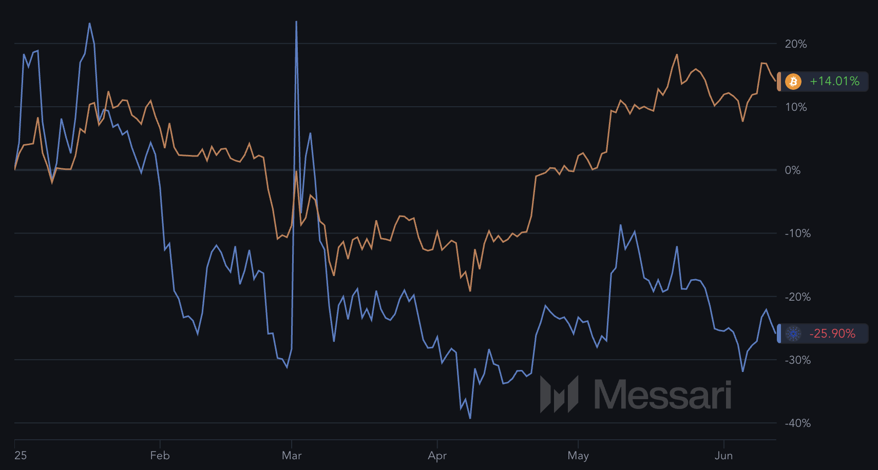 Алайда, бұл импульс тез жоғалып, екі актив арасындағы корреляция әлсірей бастады. BTC қазір жыл басынан бері шамамен 14%-ға өскенде, ADA 1 қаңтардан бері шамамен 26%-ға төмендеді.