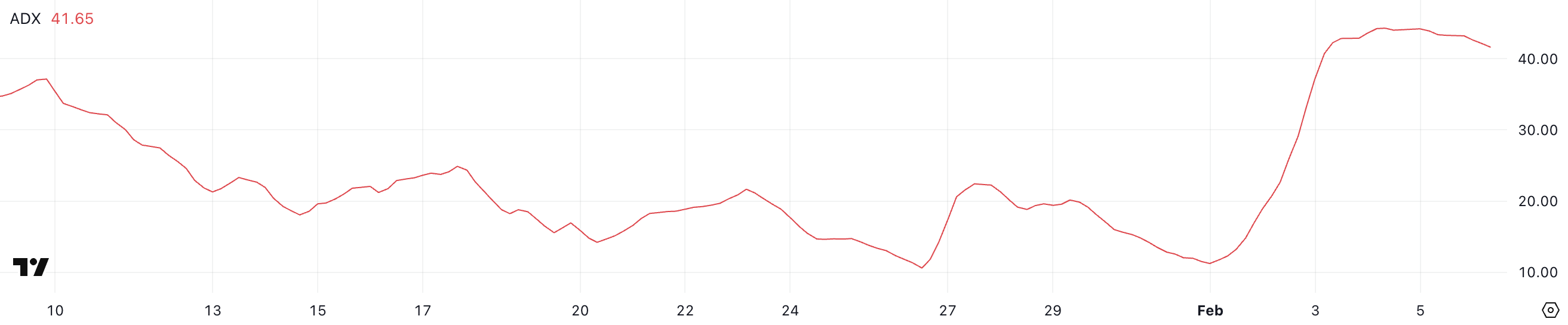 ADX трендтің бағытын емес, күшін өлшейдіб ал 25-тен жоғары көрсеткіштер күшті трендті, ал төмен көрсеткіштер әлсіздікті білдіреді. ADA-ның жоғары ADX-ін ескере отырып, соңғы төмендеу тренді күшті болып, аюлы импульсті күшейтті.