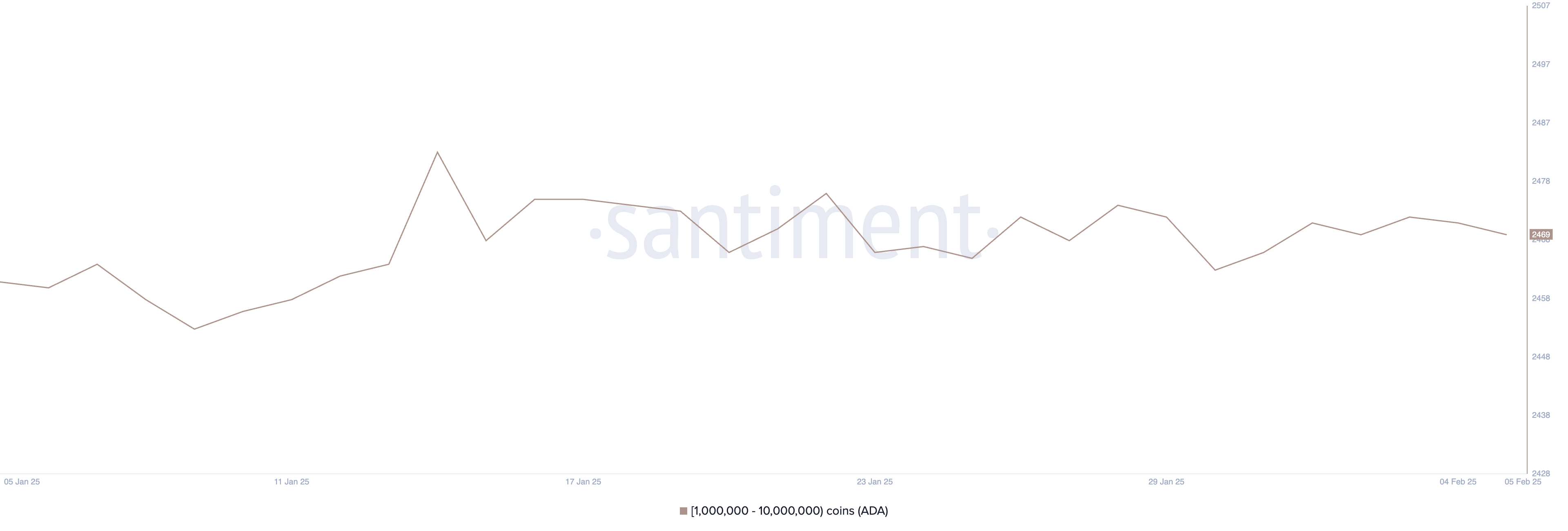 1 000 000 мен 10 000 000 ADA аралығында ұстайтын Cardano киттерінің мекенжайлар саны 9 қаңтар мен 14 қаңтар аралығында 2 453-тен 2 483-ке дейін өсті. Алайда, осы шыңнан кейін саны сәл төмендеп, соңғы бірнеше аптада тұрақты болып қалды.