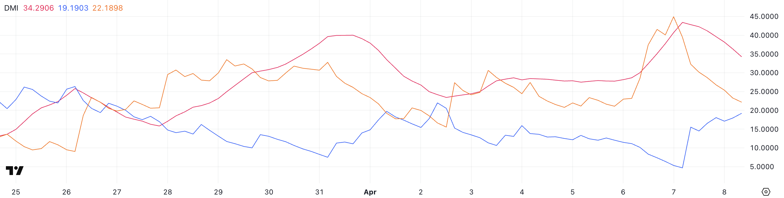 Бұл ағымдағы трендтің әлсіреп жатқанын көрсетсе де, ADX әлі де 25 негізгі шегінен әлдеқайда жоғары, яғни нарық әлі де күшті бағыттық қозғалыста екенін білдіреді.