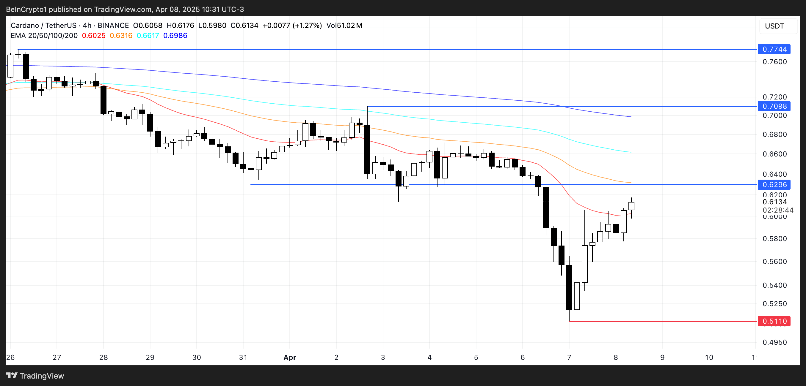 0,51 долларға қарай қозғалу бірінші дағдарыстық сынақ болар еді, ал бұл деңгейді жоғалту Cardano-ны 2024 жылдың қарашасынан бері алғаш рет 0,50 доллар шегінен төмен итермелеуі мүмкін.