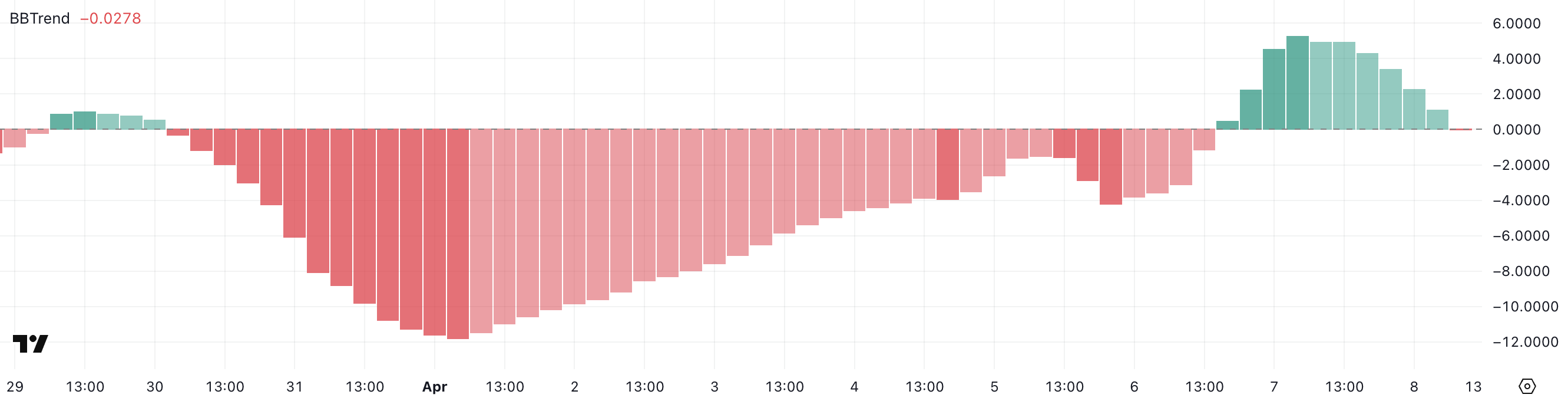 BBTrend (Bull and Bear Trend) индикаторы баға трендінің күшін және бағытын өлшейді. +1-ден жоғары мәндер әдетте күшті бұқа трендін көрсетеді, ал -1-ден төмен көрсеткіштер күшті аю трендін білдіреді.