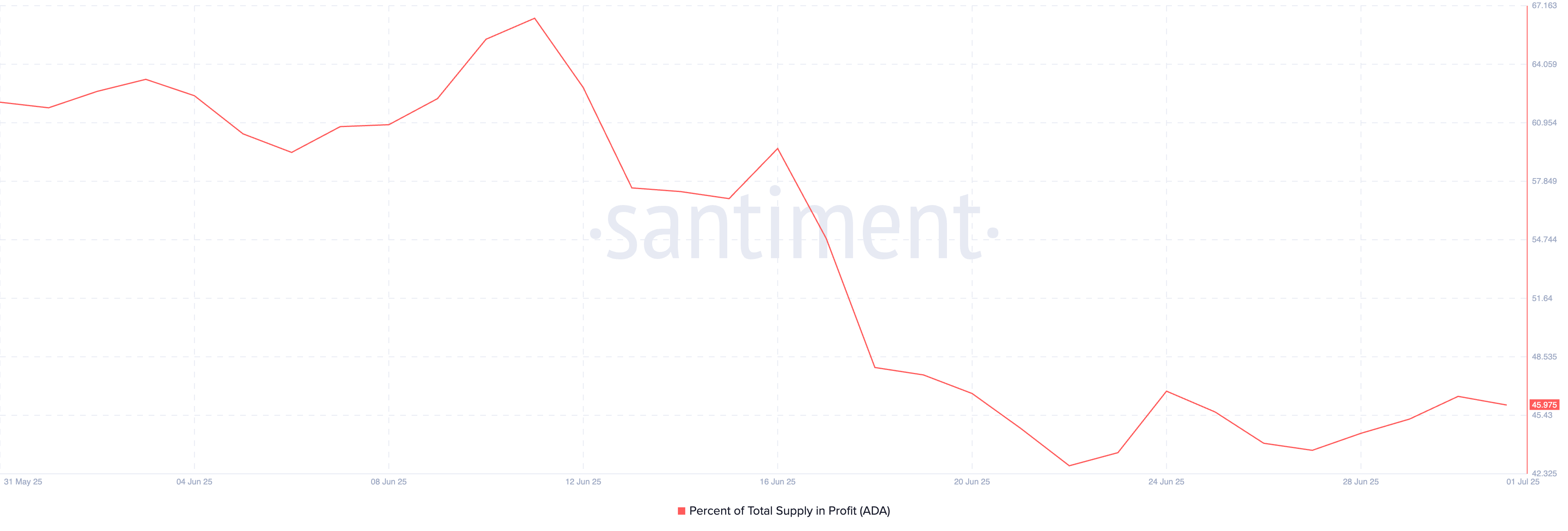 Сонымен қатар, он-чейн деректері ADA-ның пайдадағы ұсыныс пайызының төмендеуді жалғастырғанын көрсетеді. Жариялау кезінде ол 45,97% болды, өткен айда 27%-ға төмендеді.