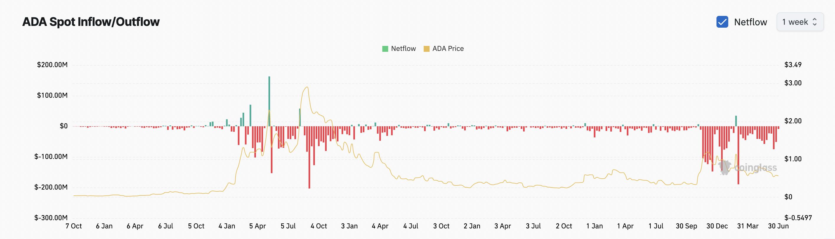 Алайда, осы оқиғаларға қарамастан, ADA-ның баға көрсеткіші әлсіз болып қалды. CoinGlass деректері ақпан айынан бастап спот нарықтарынан тұрақты апталық шығыстарды тіркегенін көрсетеді, бұл тұрақты сату қысымын және инвесторлардың қызығушылығының төмендеуін білдіреді.