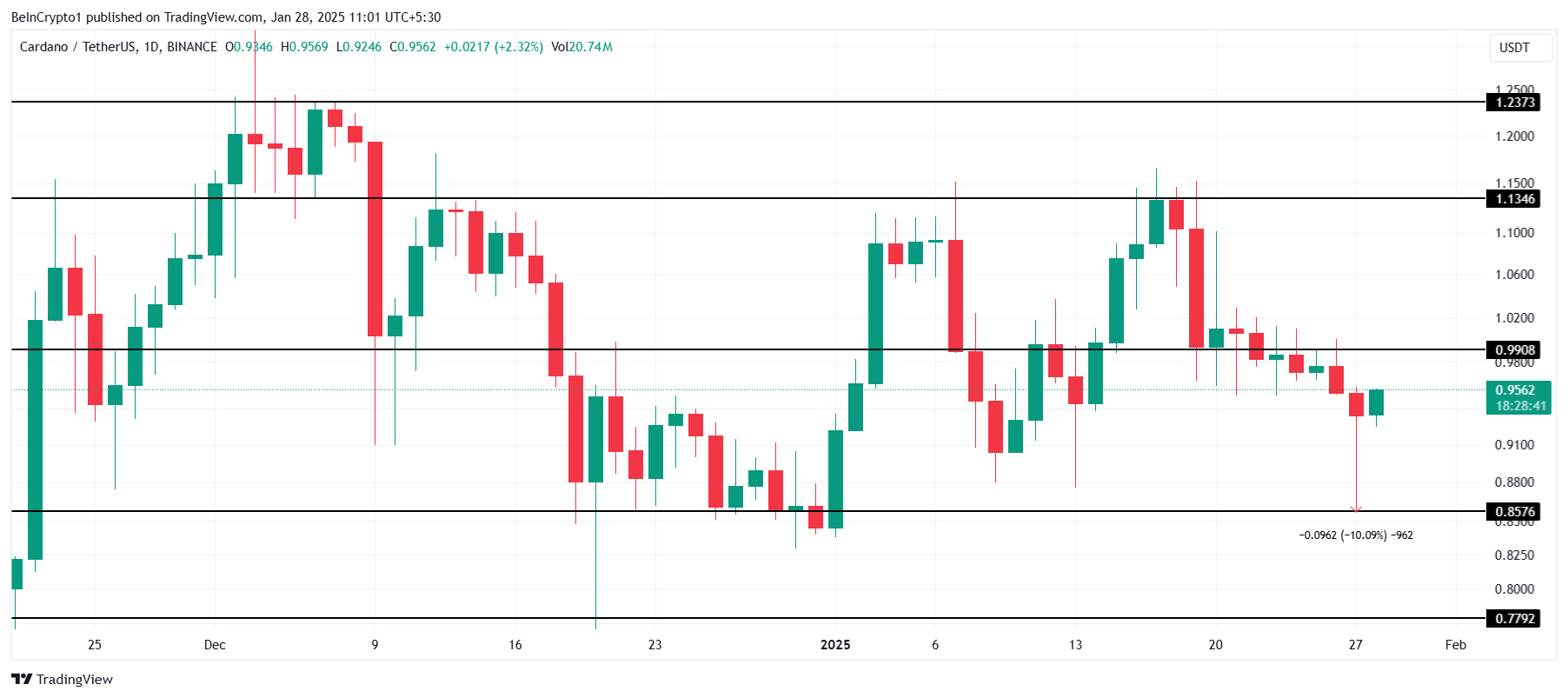 Cardano-ның бағасы соңғы 24 сағат ішінде шамамен 10%-ға төмендеп, қазіргі уақытта 0,95 доллар деңгейінде тұр. Альткоин 0,99 доллар дағдарыстық кедергіден төмен қалып, жалғасып жатқан сату қысымы мен әлсіз нарықтық көңіл-күй аясында негізгі қарсылық деңгейлерін қалпына келтіруде қиындықтарға тап болғанын көрсетеді.