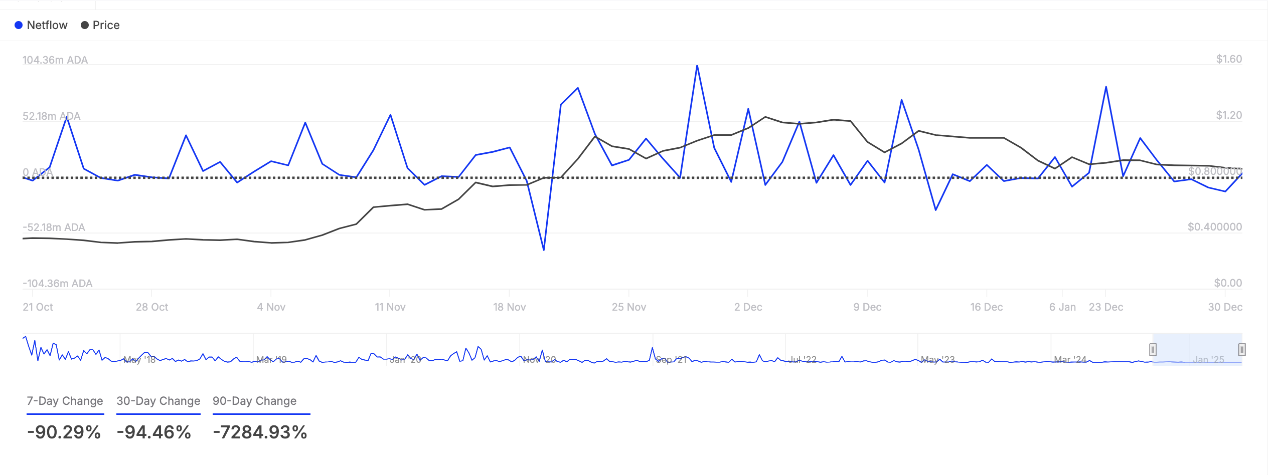 Жүзеге асырылған пайданың бұл өсуі ADA киттері арасында монеталарды тарату толқынын тудырды, бұл оның ірі иелерінің таза ағынының төмендеуімен көрінеді. IntoTheBlock мәліметі бойынша, бұл шолу аптасында 90% төмендеді.