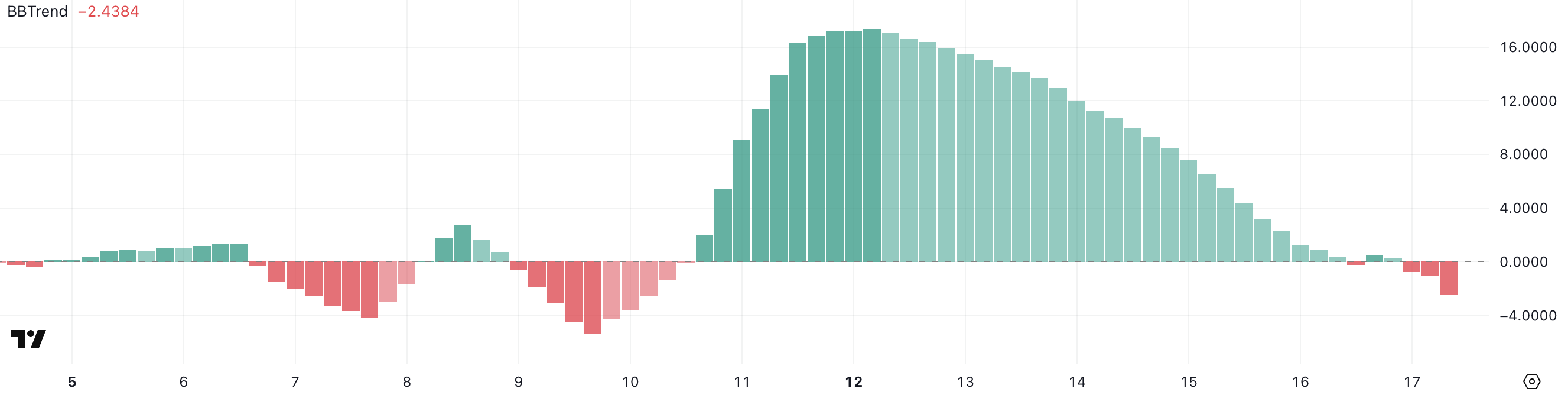 BBTrend (Bollinger Band Trend) бағаның орташа мәнінен ауытқуын құбылмалылыққа қатысты өлшейді, трендтердің күші мен бағыты туралы түсінік береді.