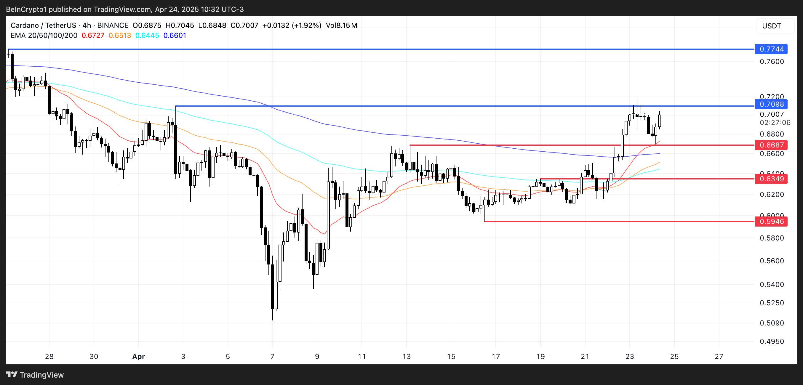 Алайда, ADA тар диапазонда саудаласуда, 0,709 долларда қарсылыққа тап болып, 0,668 долларда қолдау көрсетіліп, ықтимал бұзылу немесе төмендеу үшін жағдай жасайды.