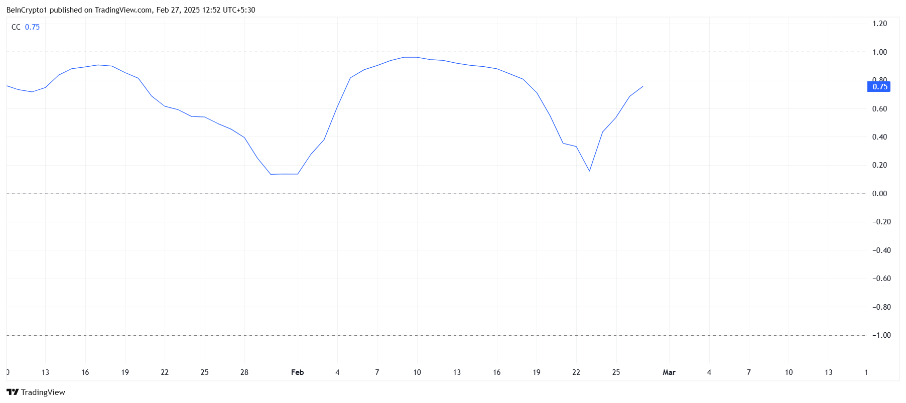Cardano-ның Bitcoin (BTC) валютасымен корреляциясы тұрақты түрде артып келеді. Қазіргі уақытта корреляция 0,75 деңгейінде, яғни ADA Bitcoin-мен бірге қозғалып келеді. Bitcoin қысқа мерзімде төмендеу қысымына тап болғандықтан, Cardano оның қозғалыстарын қайталауы мүмкін, бұл бағаны төмендетуі ықтимал.