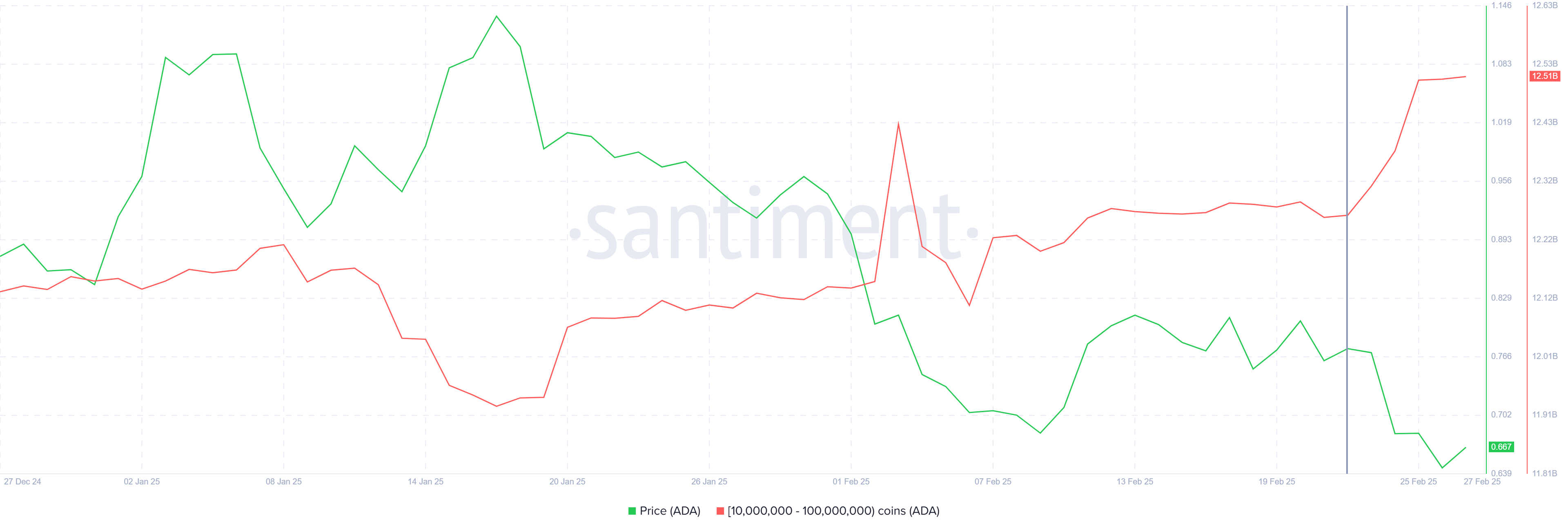 Өткен аптада 10 млн мен 100 млн ADA аралығында ұстайтын кит мекенжайлары 300 млн-нан астам ADA қосты, бұл шамамен 200 млн доллар тұрады. Бұл үлкен жинақтау Cardano бағасы төмендеген кезде де орын алды, бұл ірі инвесторлар ағымдағы бағаны мүмкіндік ретінде қарастырғанын білдіреді. Киттердің белсенділігі 20%-ға бағаның құлдырауымен сәйкес келеді, бұл олардың төмен бағаларды пайдаланып, бағаның қалпына келуін күтіп отырғанын көрсетуі мүмкін.
