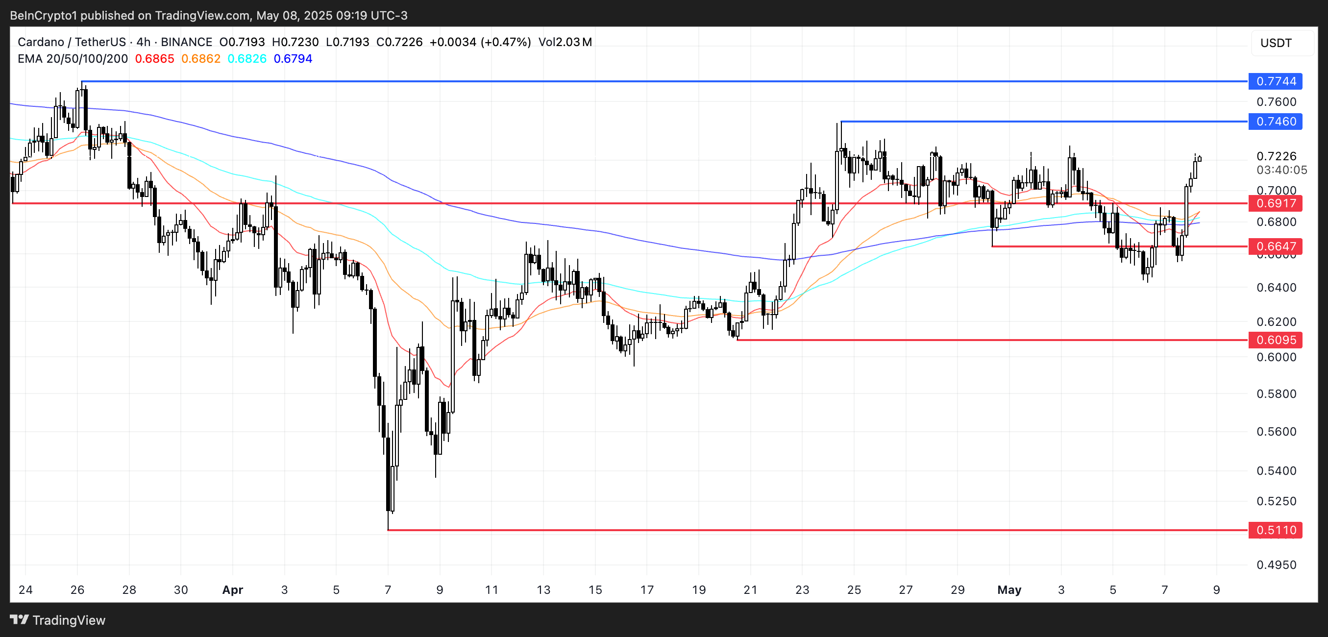 Cardano-ның EMA сызықтары тығыздалып, жақын арада алтын крест қалыптасуы мүмкін екенін көрсетеді — бұл қысқа мерзімді EMA ұзақ мерзімді EMA-дан жоғары өткенде пайда болатын бұқа сигналы.