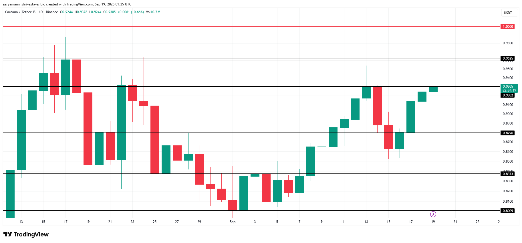Жариялау кезінде, ADA 0,93 долларға саудаланып, осы деңгейді қолдау ретінде қамтамасыз етуге тырысуда. Мұнда сәттілік токенге 0,96 доллардағы қарсылық деңгейін нысанаға алуға мүмкіндік береді. Бұл альткоин үшін жақында маңызды кедергі болып табылды.