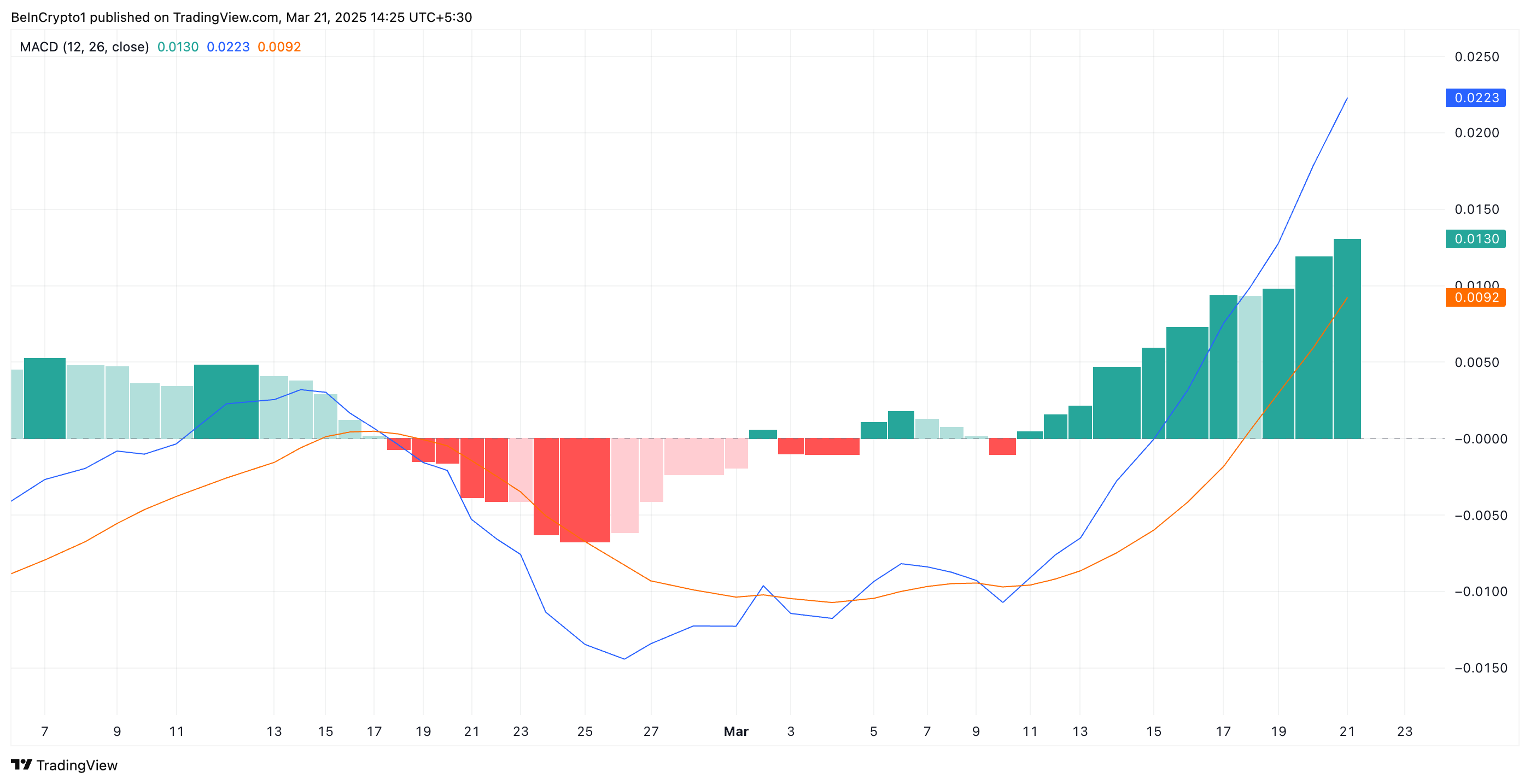 MACD сызығы сигнал сызығынан жоғары болғанда, бұл бұқа сигналы болып табылады, трейдерлер оны жиі сатып алу сигналы ретінде түсіндіреді.