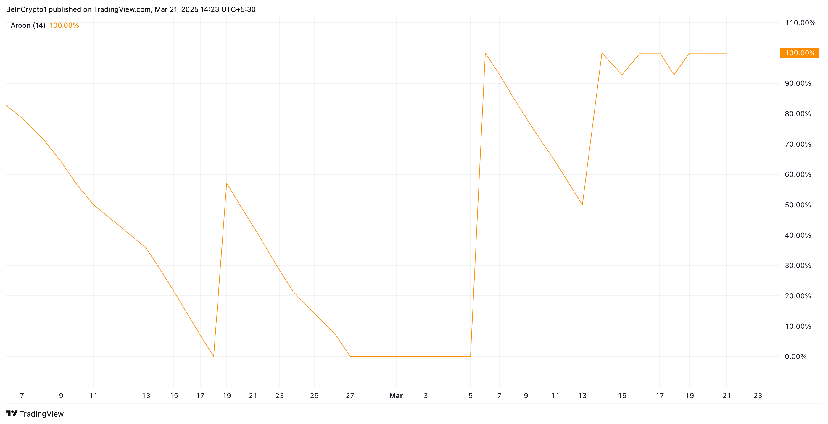 KAVA/USD бір күндік графигінде монетаның Aroon Up сызығы 100% деңгейінде, оның ағымдағы өсу трендінің күшін растайды.