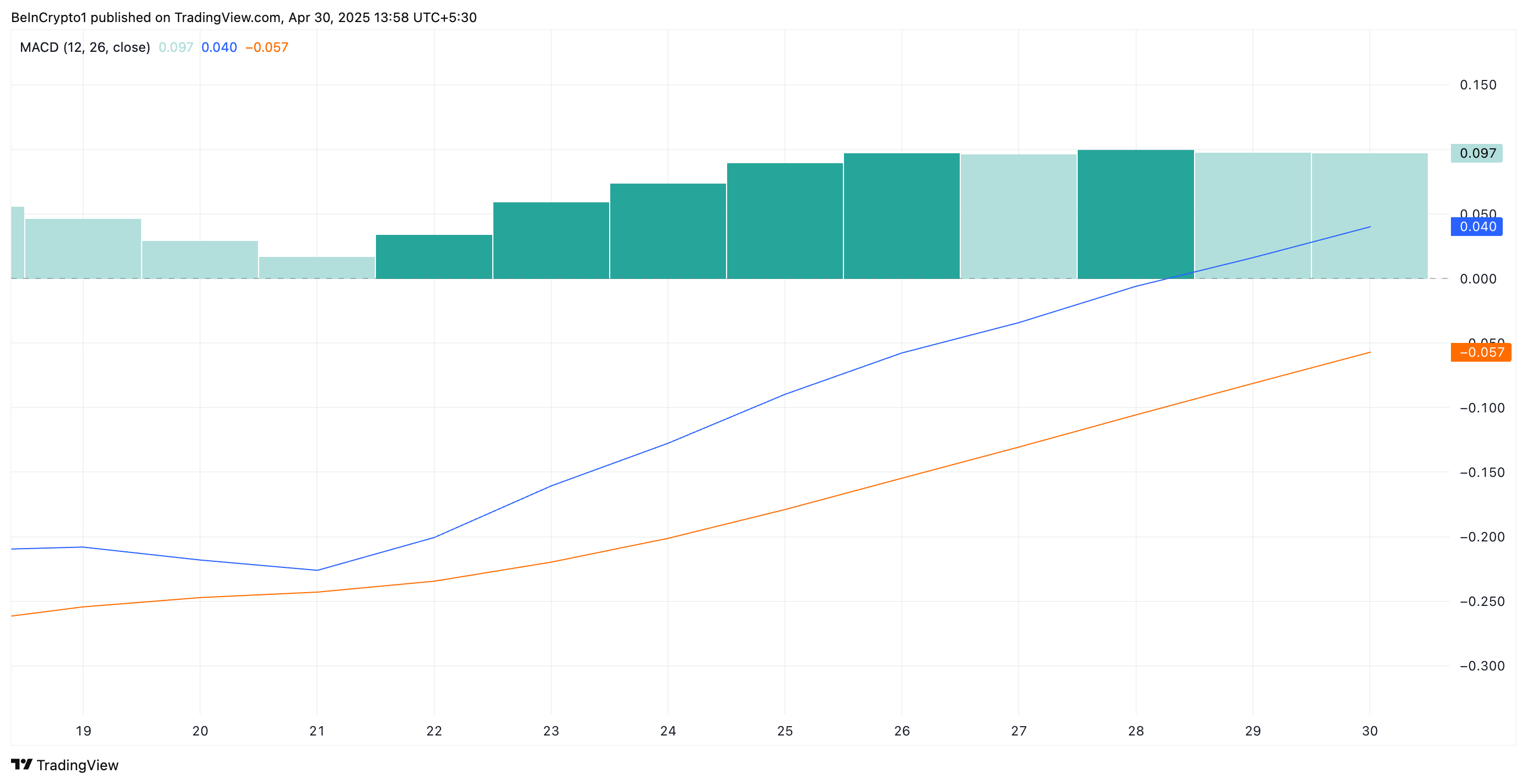 Активтің MACD индикаторы оның баға қозғалысындағы трендтер мен импульсті анықтайды. Ол трейдерлерге MACD және сигнал сызықтарының қиылысуы арқылы ықтимал сатып алу немесе сату сигналдарын анықтауға көмектеседі.