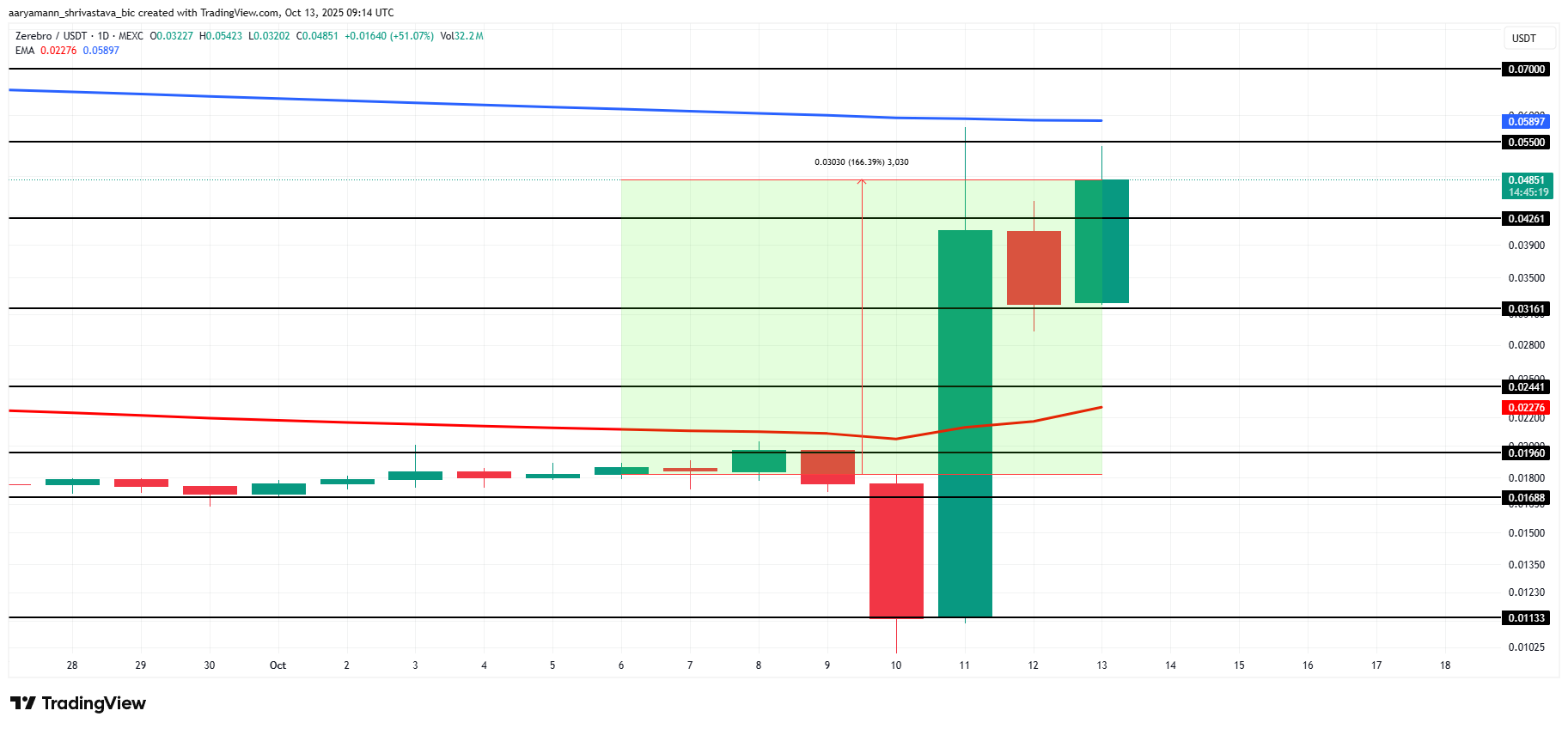 ZEREBRO осы аптаның ерекше мемкоині болып, 166%-ға өсіп, нарықта инвесторлардың назарын аударды. Альткоин қазіргі уақытта 0,0485 долларға саудаланып, кең нарықтық құбылмалылыққа қарамастан күшті бұқа көңіл-күйін көрсетуде.
