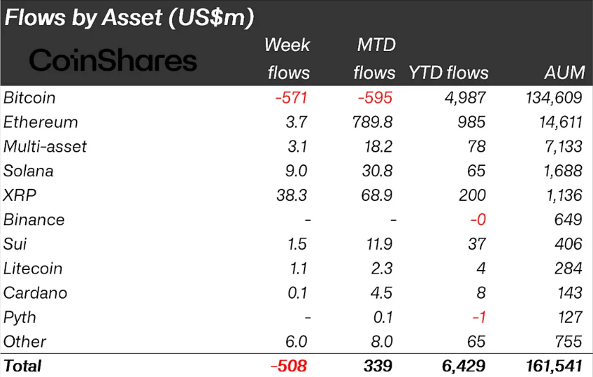 CoinShares-тің соңғы есебіне сәйкес, Bitcoin (BTC) инвесторлардың сақтығының негізгі ауыртпалығын көтеріп, 571 млн доллар ағындарын көрді. Сонымен қатар, кейбір трейдерлер қысқа позицияларды арттыруды таңдады, бұл қысқа-Bitcoin өнімдеріне 2,8 млн доллар ағындарын әкелді.