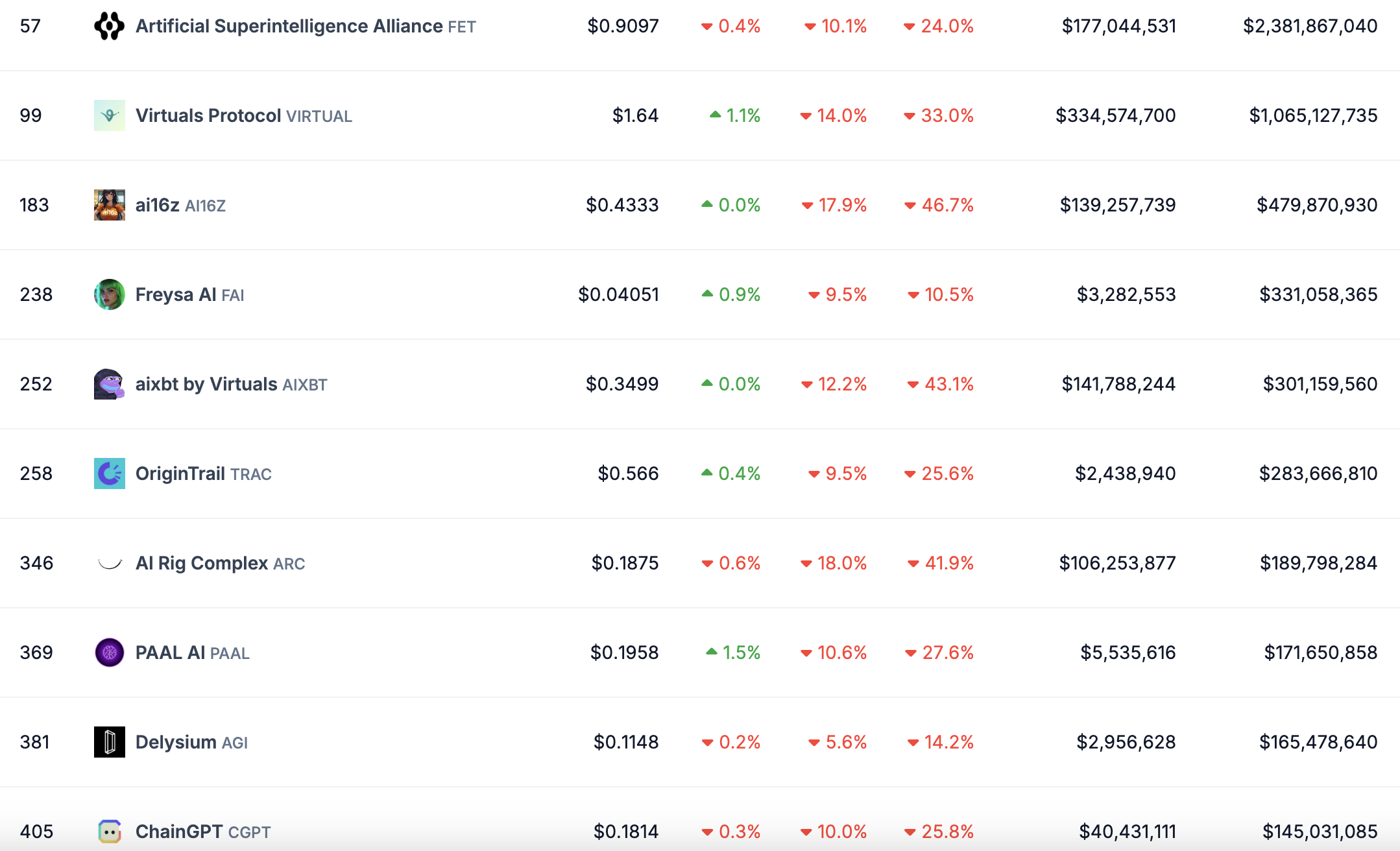 VIRTUAL крипто AI агенттері токендерінің кеңірек түзетулерінің негізгі мысалы болып табылады. Қаңтардың 2-сінде өзінің шыңында ол қысқа уақытқа TAO және RENDER-ден асып, ең үлкен AI монетаға айналды, нарықтық капитализациясы 5 млрд доллардан асты.