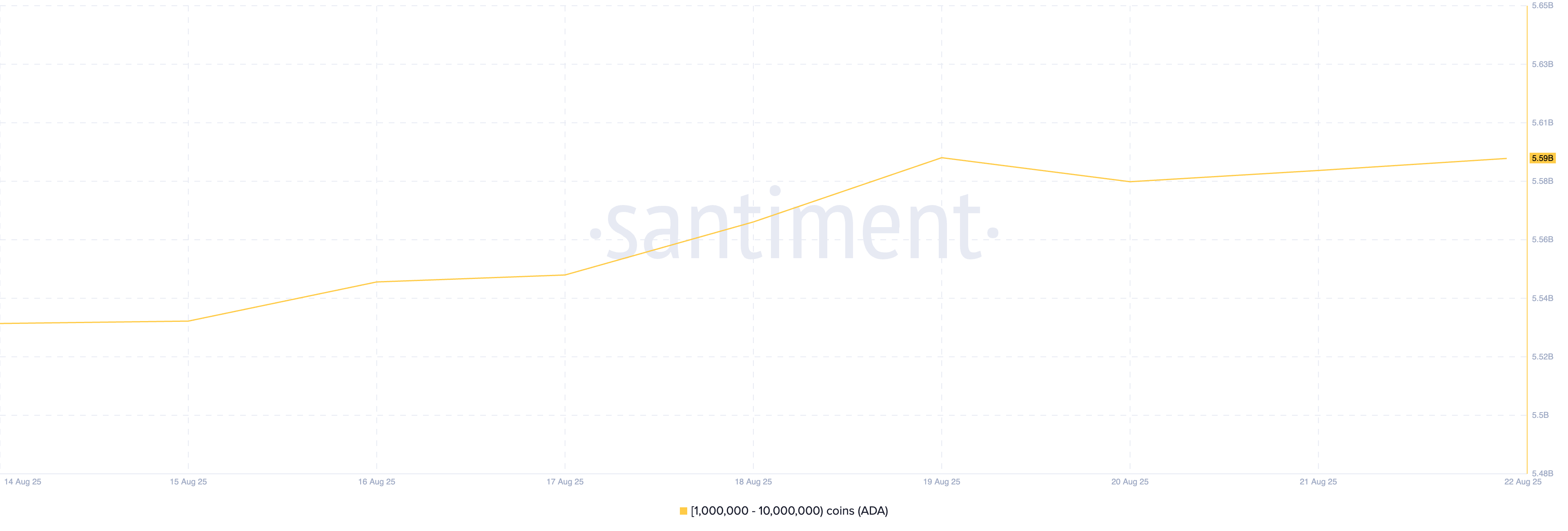 Бірінші деңгейлі (L1) монета ADA осы аптада кеңірек нарықтың төмендеуіне қарамастан, крипто киттер арасында стратегиялық жинақтау байқалды. Он-чейн деректеріне сәйкес, 1 млн мен 10 млн монета ұстайтын киттер шолу аптасында 60 млн ADA монетасын сатып алды.