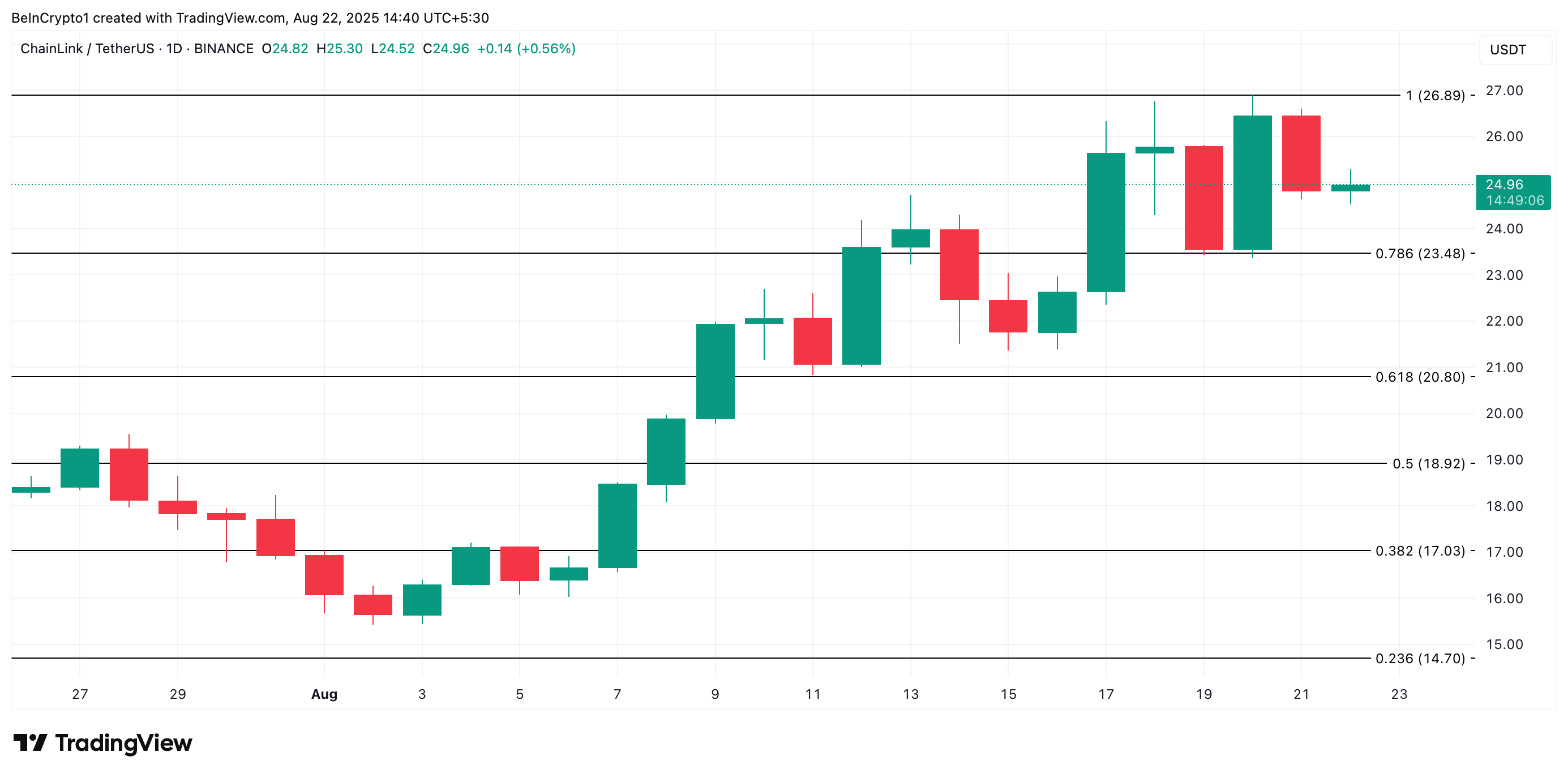 Киттердің белсенділігінің бұл өсуі токеннің жақын болашақтағы перспективаларына деген сенімділіктің артуын білдіреді. Егер жинақтау жалғаса берсе, LINK 26,89 долларға дейін көтерілуі мүмкін.
