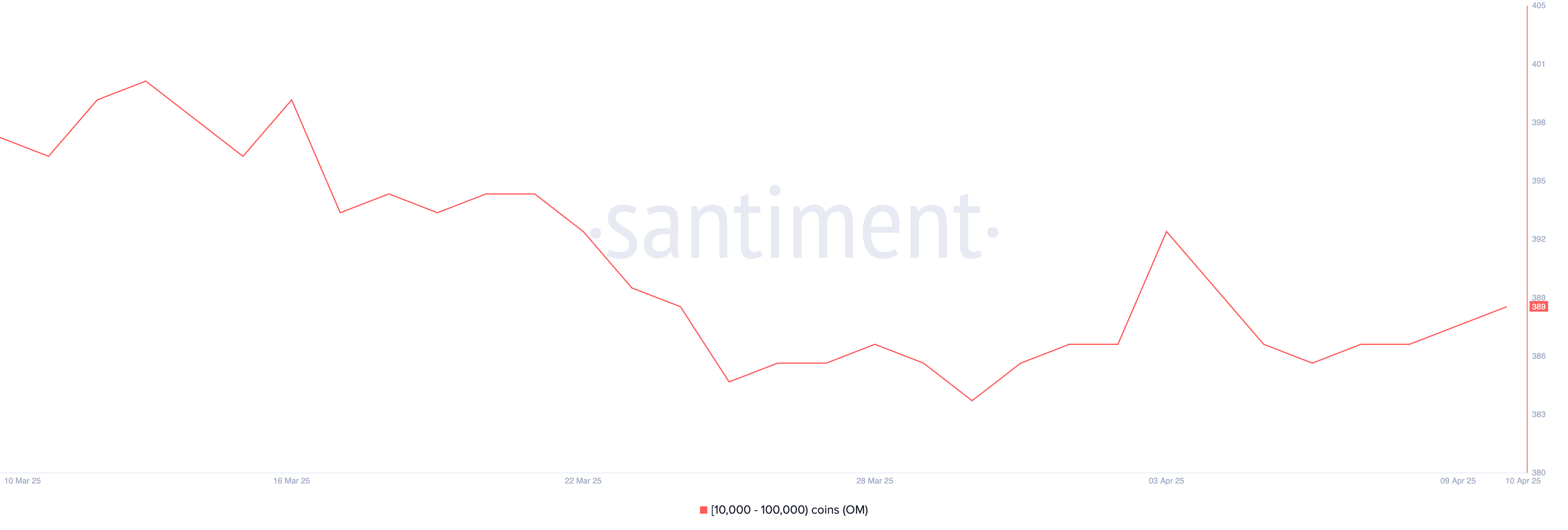 RWA нарративі күшейіп келе жатқандықтан, OM айтарлықтай өсуі мүмкін. 6 сәуір мен 10 сәуір аралығында 10,000-нан 100,000-ға дейін токен ұстайтын OM кит мекенжайларының саны 386-дан 389-ға дейін өсті, бұл тыныш жинақталуды білдіреді.