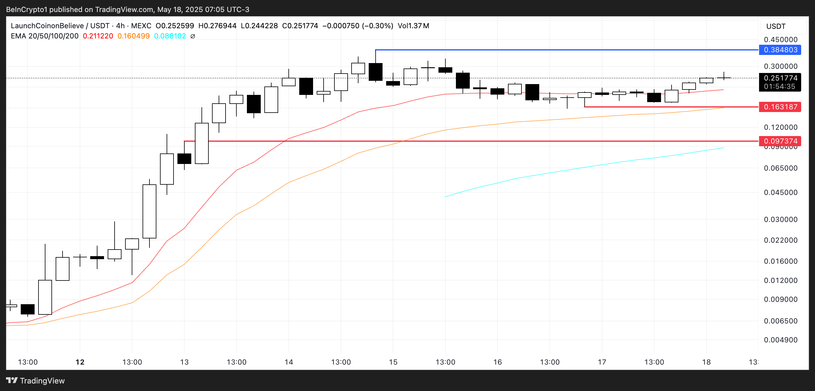 Believe App-тың жергілікті токені LAUNCHCOIN соңғы жеті күнде шамамен 3 000%-ға өсіп, 0,008 доллардан 0,25 долларға дейін көтерілді. Бұл жылдам баға өсуі оның нарықтық капитализациясын шамамен 250 млн долларға жеткізді.