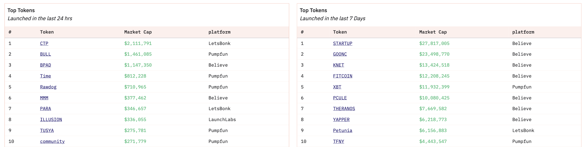 Дегенмен, кейбір Believe токендері табысқа жетуде. Соңғы жеті күнде Solana іске қосу алаңдарында іске қосылған ең ірі жеті токен Believe App-тан шыққан.