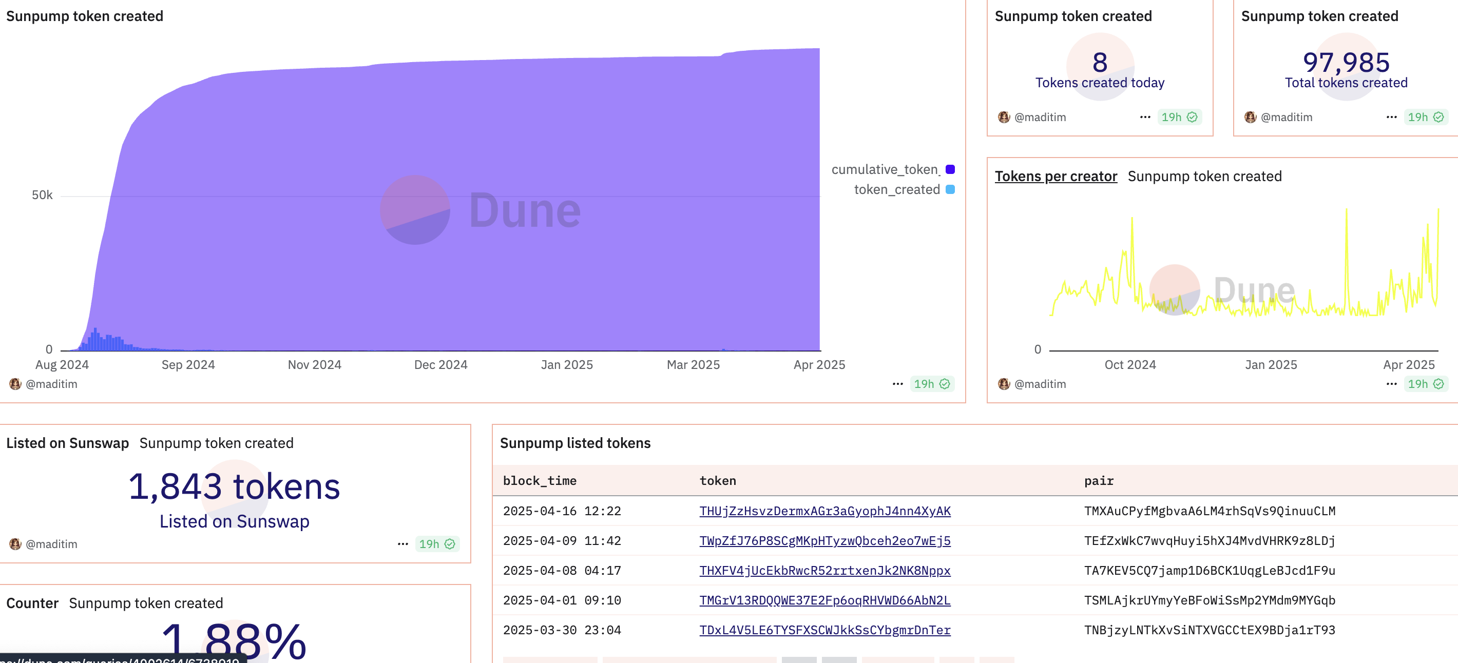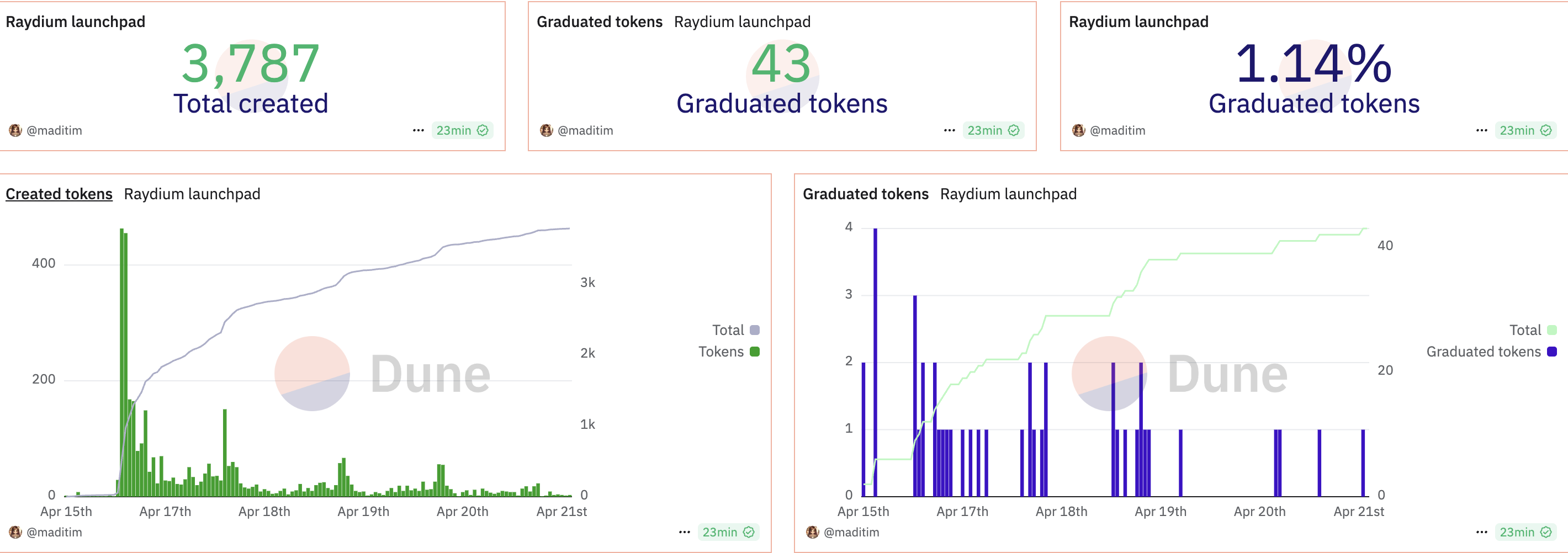 Dune Analytics деректеріне сәйкес, SunPump бүгін тек сегіз токен жасады, ал Dgen.fun 21 токен жасады. Бұл сандар екі платформаның да Raydium LaunchLab немесе Pump.fun-ның ауқымымен әлі бәсекелесе алмайтынын көрсетеді.