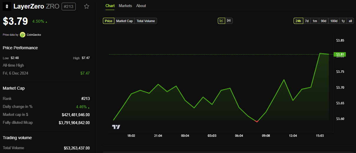 BeInCrypto деректері көрсеткендей, LayerZero-ның ZRO токені жұма сессиясы ашылғаннан бері шамамен 5%-ға өсті. Бұл жазу кезінде ол 3,79 доллармен саудаланып жатты.