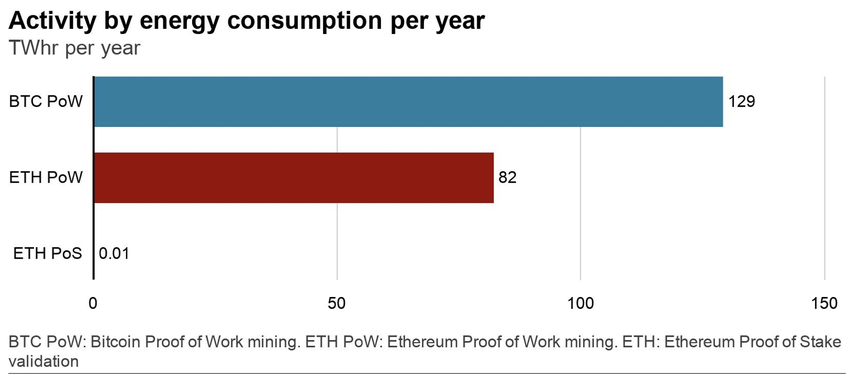 - Энергия тұтыну: Proof-of-Work (PoW) желілері транзакцияларды растау үшін үлкен есептеу қуатын қажет етеді. Бұл жоғары энергия шығынын тудырып, блокчейн технологиясының экологиялық әсеріне қатысты алаңдаушылық туғызады. Proof-of-Stake (PoS) және басқа консенсус механизмдері экологиялық тұрғыдан тиімді баламалар ұсынады. Төмендегі график ең көп қолданылатын екі консенсус механизмі арасындағы үлкен айырмашылықты және Ethereum-ның энергияны көп қажет ететін PoW-дан әлдеқайда экологиялық таза PoS-қа көшуінің әсерін көрсетеді.