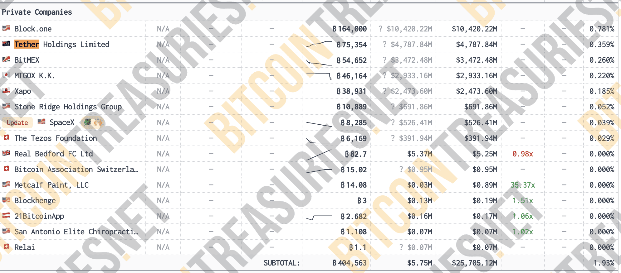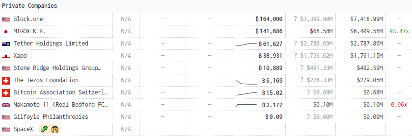 - Block.one: Қытайда орналасқан Block.one, EOSIO ашық бастапқы блокчейн платформасының артында тұрған компания, бұл тізімде ол 140 000-164 000 BTC-мен көш бастап тұр. Бұл бірнеше мекенжайлар бойынша жинақталған көрсеткіш.