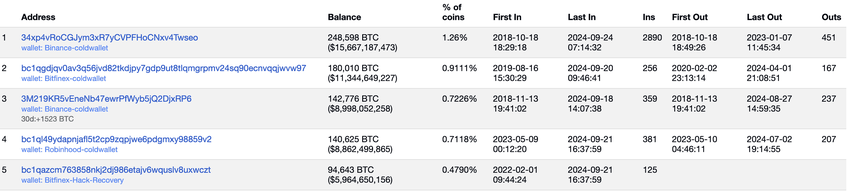 2024 жылдың қыркүйегінде аздаған өзгеріс болды. Ең ірі бес BTC әмияны жалпы ұсыныстың 4%-дан астамын ұстап отыр, ал ең ірі екі әмиян жыл басынан бері өз позициясын сақтап келеді.