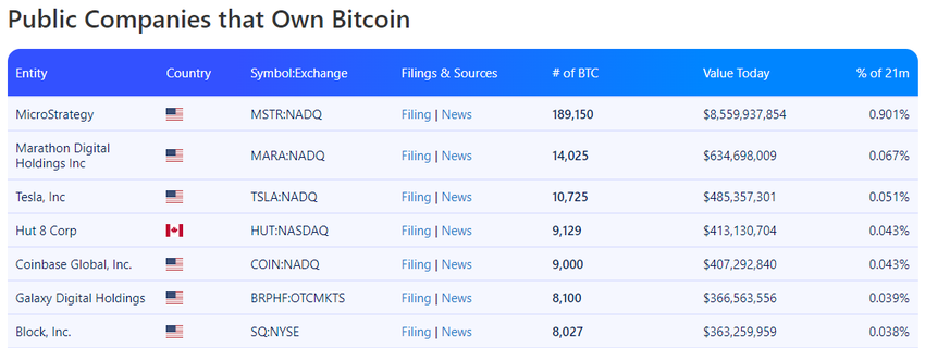 Осыған байланысты, BTC-ды көп көлемде ұстайтын кейбір мемлекеттік және жеке компанияларды қарастырайық.