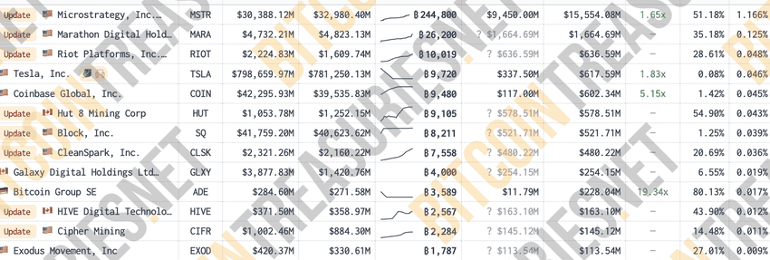 - MicroStrategy (MSTR): MicroStrategy биткоинның ең ірі корпоративтік иесі болып табылады. Вирджиния штатында орналасқан бизнес-аналитикалық бағдарламалық жасақтама өндірушісі қазіргі уақытта өз қазынасында 244 800-ден астам BTC ұстап отыр. MicroStrategy-ді негізін қалаушы және бас директор Майкл Сейлор басқарады, ол өзі ең көп биткоин ұстайтын жеке тұлға атағына үміткер.