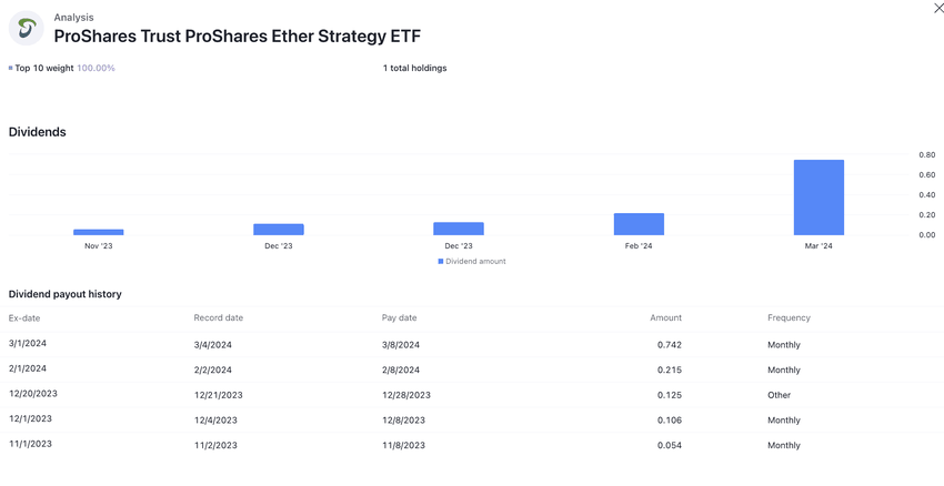 Біріншіден, ETH ETF-тері инвесторларға Ethereum бағасына бір жолмен немесе басқа жолмен әсер етуге мүмкіндік береді. Бұл TradFi фирмалары және қор биржалары арқылы жүзеге асады. Сонымен қатар, ETH ETF-тері пассивті табыс әкелуге көмектеседі. Мысалы, ProShares ETH Futures ETF дивидендтер ұсынады.