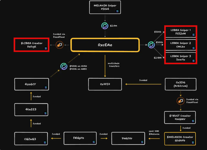 Келесі суретте LIBRA токенінің снайперлері мен жасаушыларының MELANIA токенімен де байланысты болғанын көре аласыз. Бұрын айтылғандай, жобаның жасаушысы немесе кездейсоқ боттар жобаға снайпинг жасай алады. Алайда, командалардың снайпинг жасау мақсатында токендер жасау тәжірибесі кең таралуда.