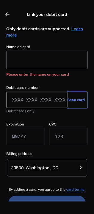 Coinbase – Биткоинді онлайн сатып алудың тағы бір оңай жолы. Ол АҚШ-та орналасқан және Фред Эрсам мен Брайан Армстронг құрған. Бастау үшін басқа биржалардағыдай тіркелгі жасау қажет. Алайда Coinbase белгілі бір «тұтынушыны таны» (KYC) саясаттарын ұстанады, сондықтан фотосуреті бар жеке куәлігіңізді растауыңызды сұрайды. Бұл рәсім аяқталғаннан кейін дебеттік карта арқылы Биткоинді бірден сатып алуға болады. Ірі сатып алулар үшін Coinbase банк шотыңызды енгізуді талап етеді, ал дебеттік карта негізінен шағын сатып алуларға арналғанын ескерген жөн.