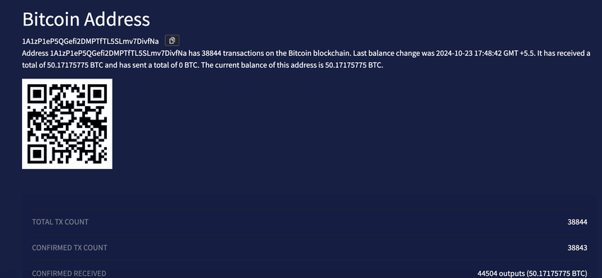 Сіз білесіз бе? «1A1zP1eP5QGefi2DMPTfTL5SLmv7DivfNa» әмияны Сатоши Накамотоға қатысты деп айтылатын ең танымал мекенжайлардың бірі. Қазіргі уақытта бұл мекенжайда 50 BTC сақтаулы және оның балансы соңғы рет 2024 жылдың 23 қазанында өзгерді.