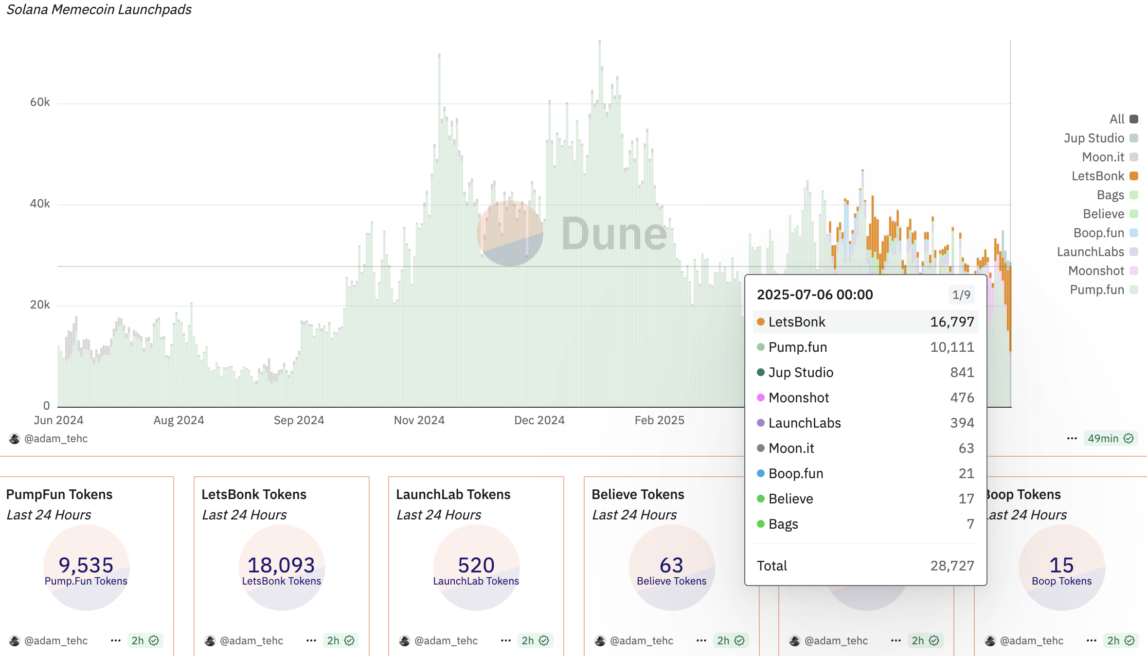 Соңғы 24 сағат ішінде, Dune деректеріне сәйкес, LetsBonk әсерлі 18 093 мемкоин іске қосты, бұл басқа мемкоин іске қосу платформаларымен салыстырғанда таңғаларлық көрсеткіш. Олардың ішінде SAVOUR және WUKONG сияқты мемкоиндер айтарлықтай толқындар тудырып, платформаның танымалдылығын арттыруға үлес қосты.